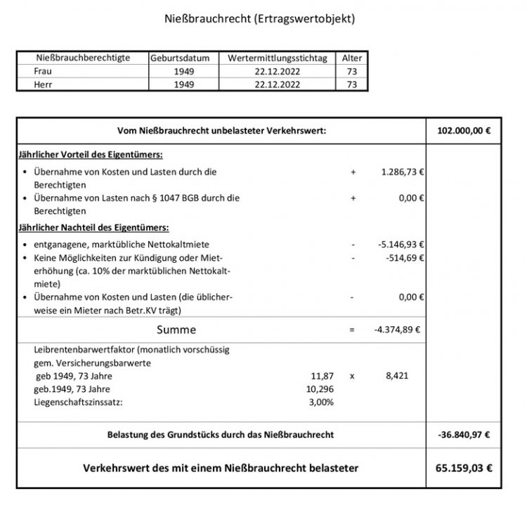Das Rechenbeispiel zeigt damit anschaulich, warum der Wert eines Nießbrauchrechts immer individuell ermittelt werden muss und weshalb pauschale Abschläge in der Praxis nicht weiterhelfen.